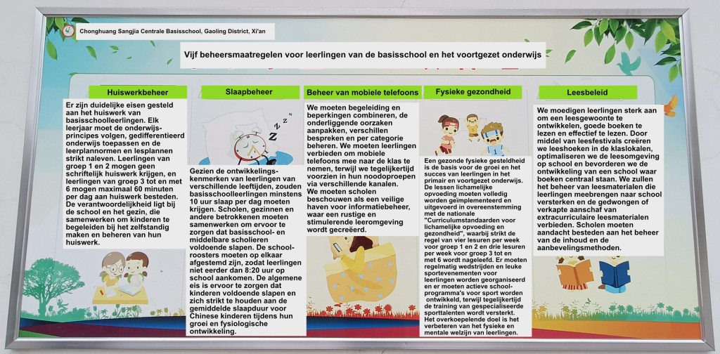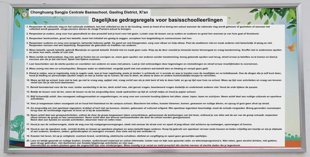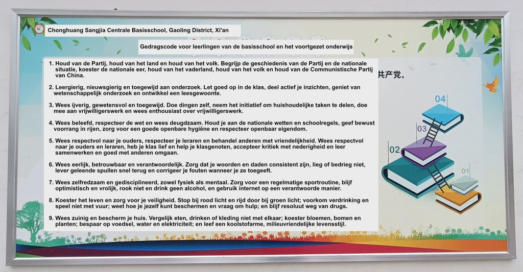 In China wordt dit bij de basisscholen opgenomen van af de eerste dag dat ze in groep 1 het lokaal binnen lopen. Ook zijn diverse regels te lezen voor de ouders/verzorgers zodat deze ook deze kennis meekrijgen en hiernaar kunnen handelen.