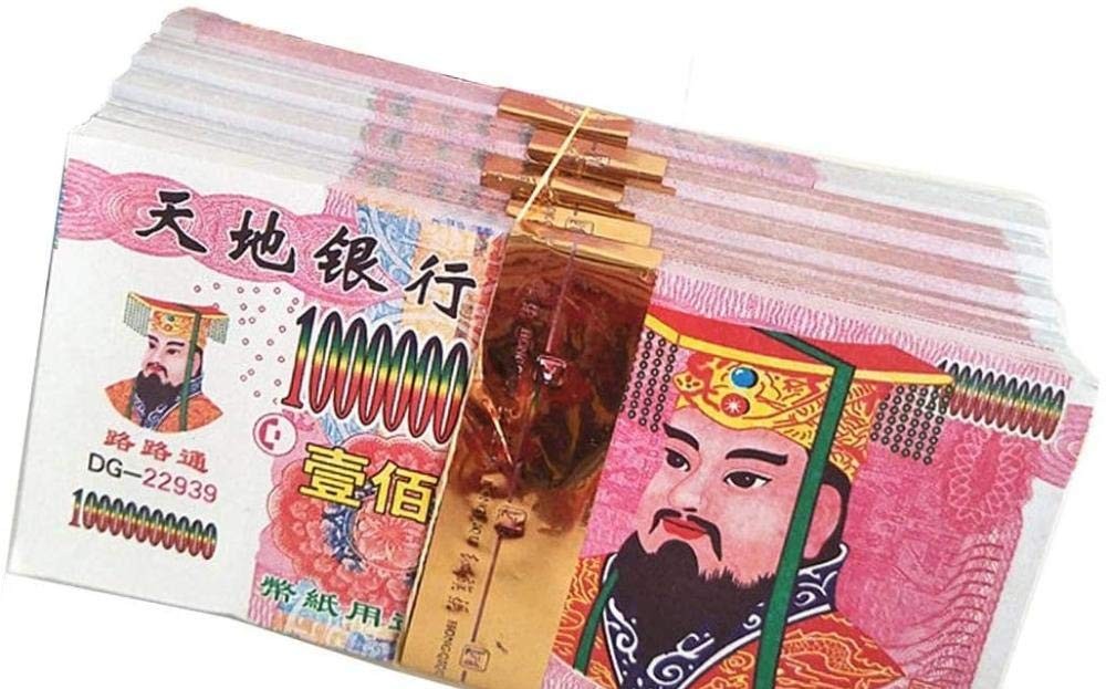 Nee geen echt geld en goederen, maar speciaal voor ritueel verbranden voor de overledenen. Je kunt geld in euro’s, dollars, Chinese RMB of andere kopen. De goederen zijn van een karton zijn en verschillende vormen hebben. De meest verkochte zijn huizen en auto’s. Maar ook gewoon wenspapier is in geel met een rode gevormde rand verkrijgbaar.